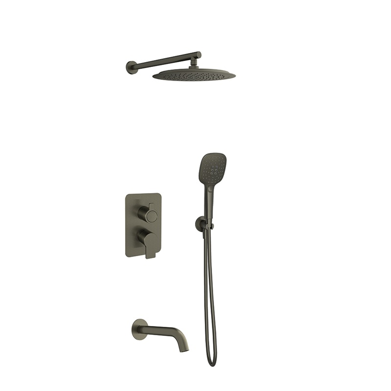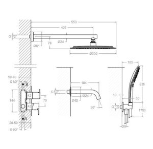 Shower set with concealed single lever 3 ways mixer, water outlet, semi-square ABS hand shower with three functions with anti-lime system, metal ultraslim round headshower Ø300mm, 190mm wall-mounted round bathtub spout, flexible shower hose 1,75m with swivel end Soleflex S2 system for 50% water saving, cooltouch anti burn system, temperature limiter.