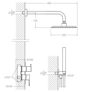Single lever 2 way concealed with support plus water intake, hand shower and ABS shower head 225×225 mm.