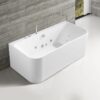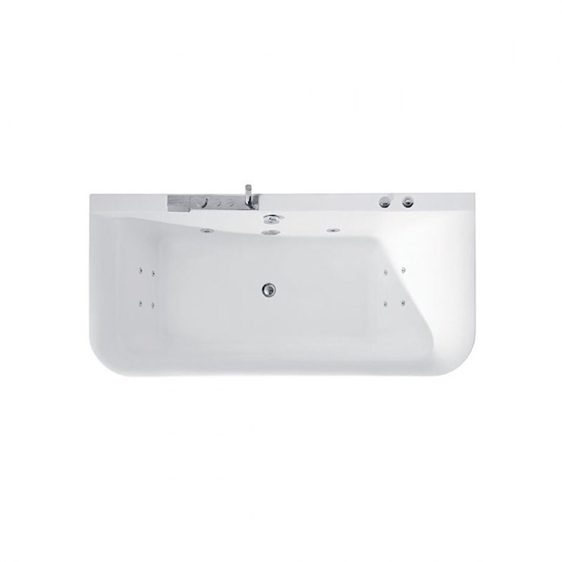 This very beautiful hydro massage bathtub has a very particular and elegant design. It has a perimetrical single acrylic panel end a self supporting perimetrical metal base. Full set of mixers of very modern design is installed on the bathtub. The cascade is made in inox and has very particular slim and discret lines. The deviators are push buttons. All the system is based in a metallic chrome plate. At the right part of the tub are installed the two pneumatic commanders for the hydromassage system. There are 2 big massage jets and 8 minijets. The pump is 1HP/750W. The automatic drainer with waterflow is included. The bath tub can be placed in a straight wall but also in a corner. It is covered by a 2 year warranty and it is delivered in carton and wooden box for maximum safety.