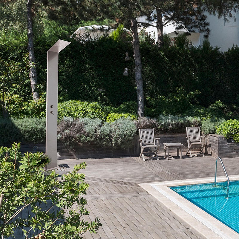 Shower column for swimming pool, made entirely of stainless steel with outdoor treatment.